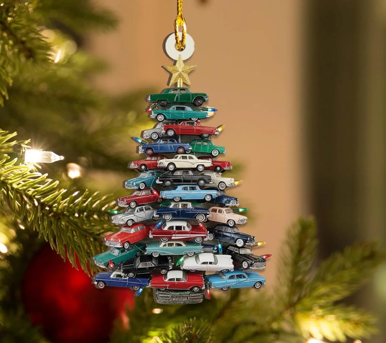 🚗🎄 This one-of-a-kind ornament turns a lineup of vintage cars into a festive Christmas tree, bringing retro charm and collector energy to your holiday décor.